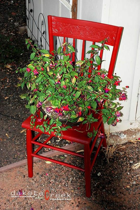 Si tienes una vieja silla de madera que estas a punto de desechar a la basura, es tu oportunidad de convertirla en una bella decoración para tu jardín o el frente de tu casa. Basta darle una nueva capa de pintura en una tonalidad brillante y llamativa para luego poder usarla como base para colocar una maceta con flores o plantas. Si quieres llevar este proyecto a un siguiente nivel, puedes optar por hacer un hueco en la parte del asiento de la silla, para que al colocar una maceta, esta casque perfectamente bien. Inspírate con todas estas imágenes que hemos recopilado de la web para ti:
